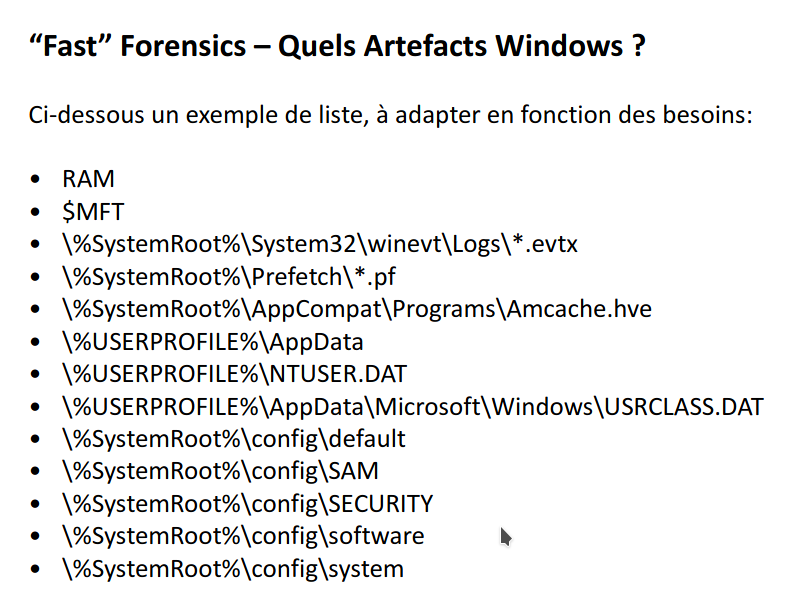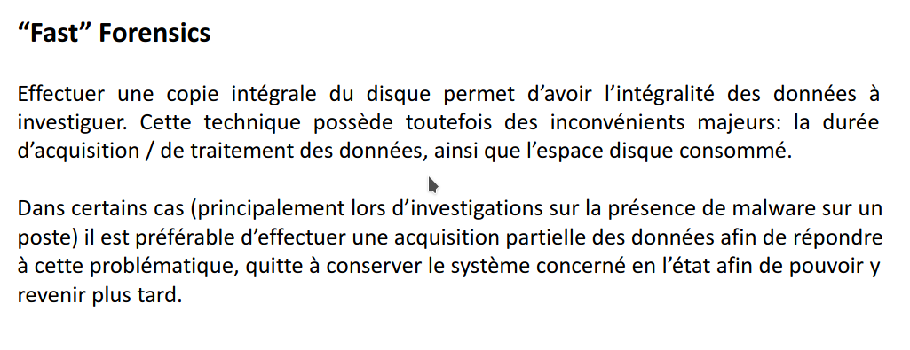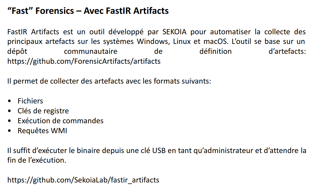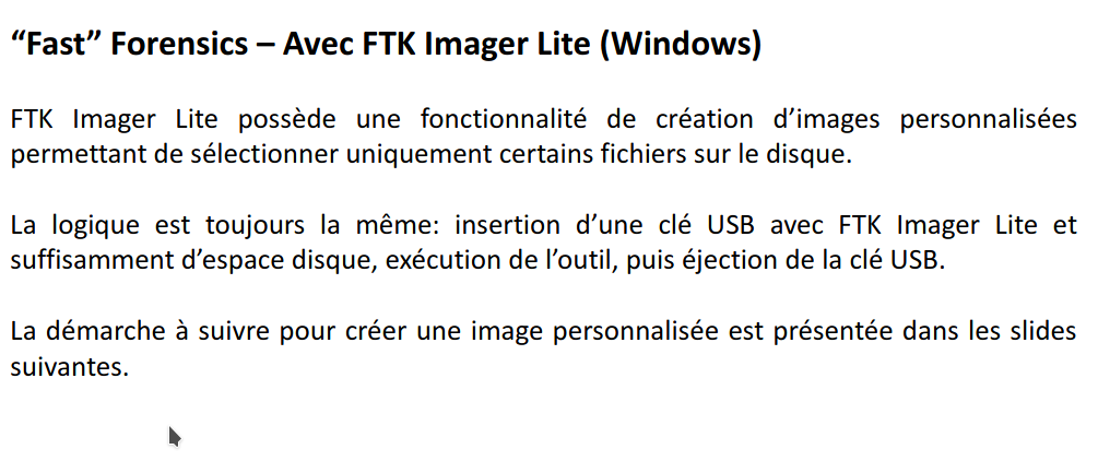FTK Imager Lite For usage, see : Formation_DFIR.pdf (slide 622) FastIR https://github.com/SekoiaLab/fastir_artifacts
