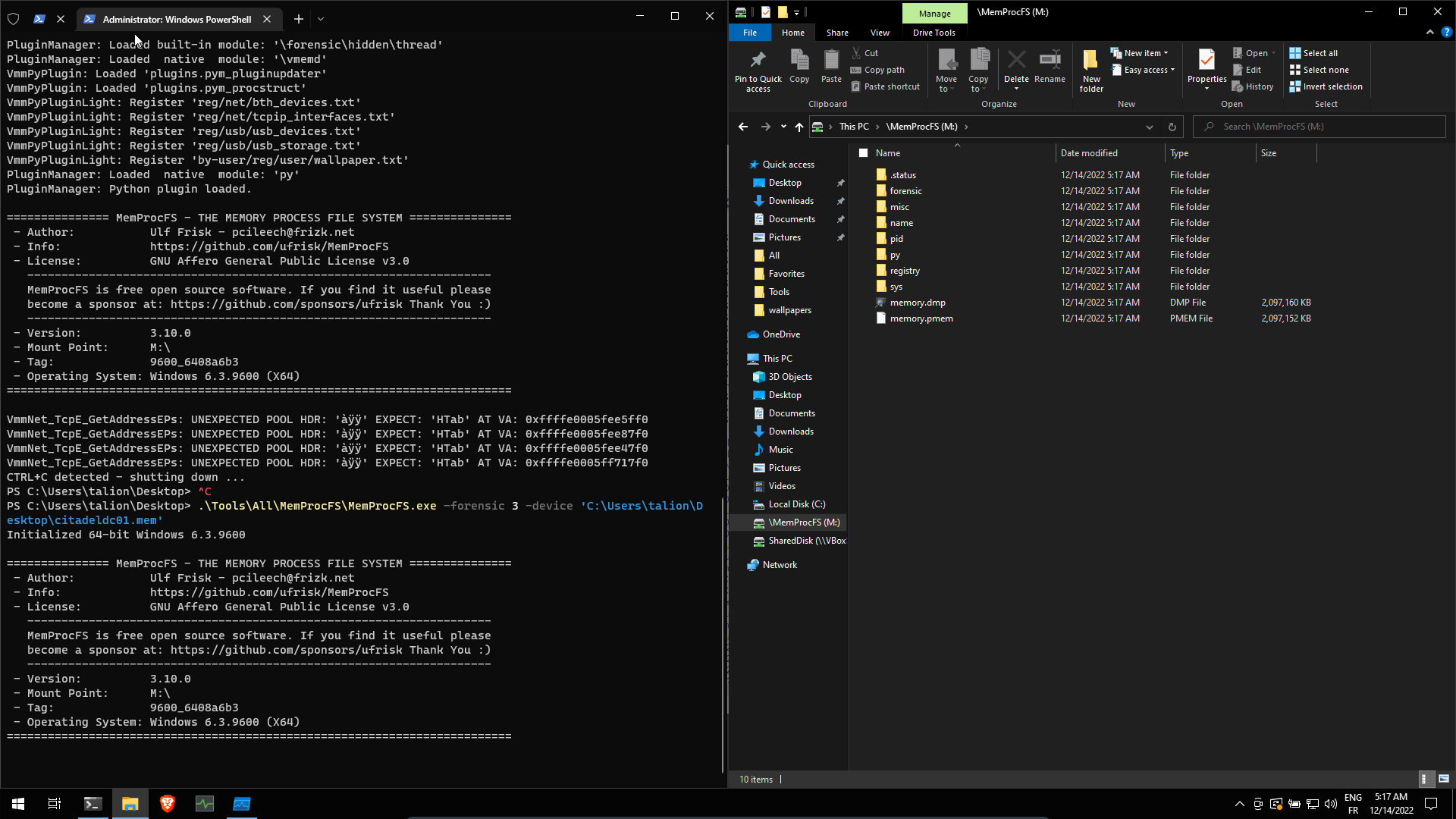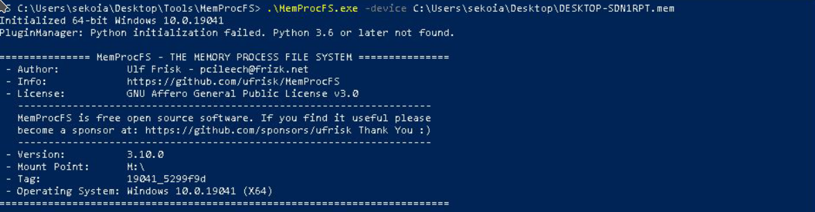By running MemProcFS, If you have an error message saying that dokan1.dll is missing, install : https://github.com/dokan-dev/dokany/releases/tag/v1.5.1.1000