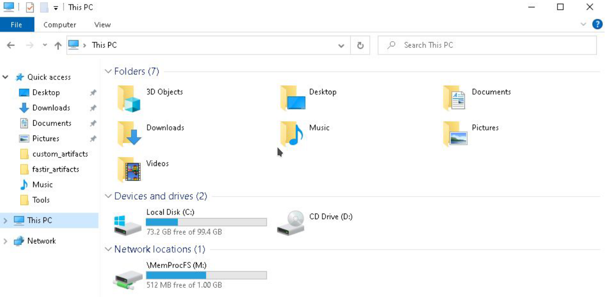 $./memprocfs -mount /home/sekoia/mnt_img -device /home/sekoia/image.rawSous Windows, le logiciel créera un disque partagé (par défault sur le lecteur M, l’option