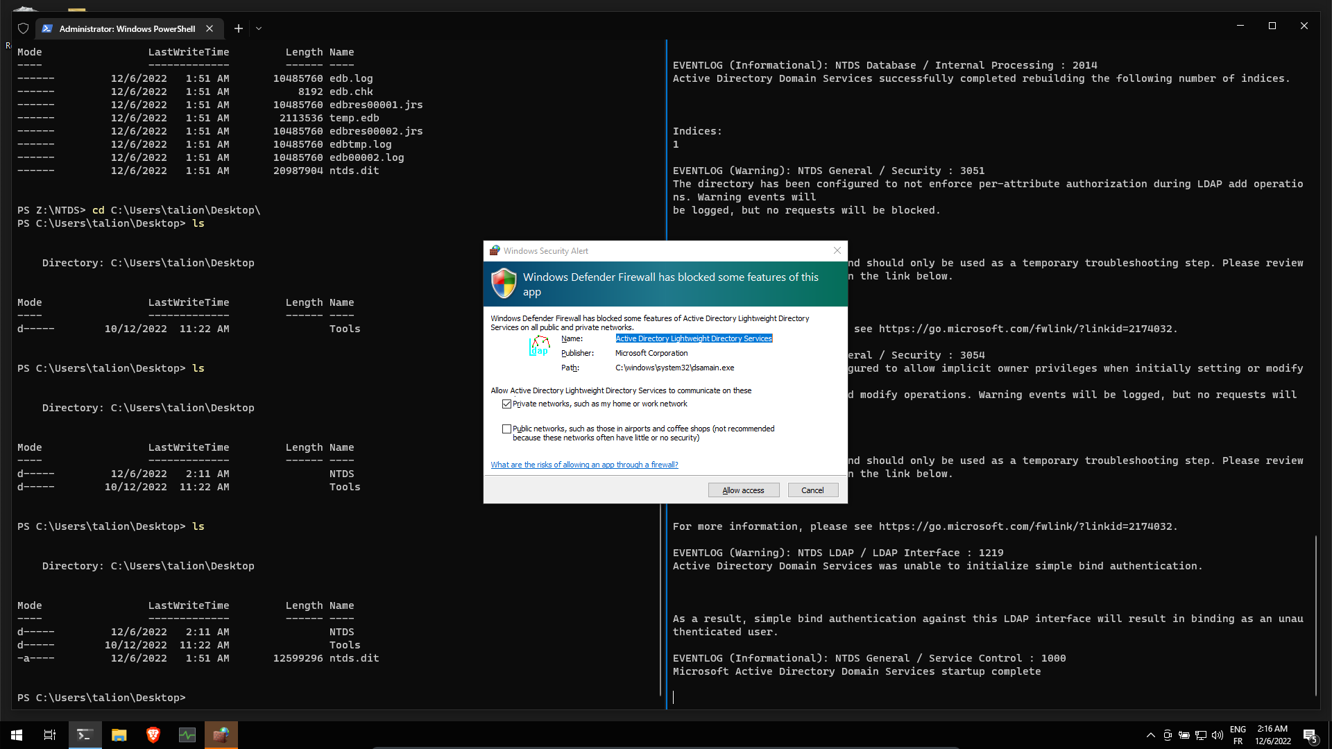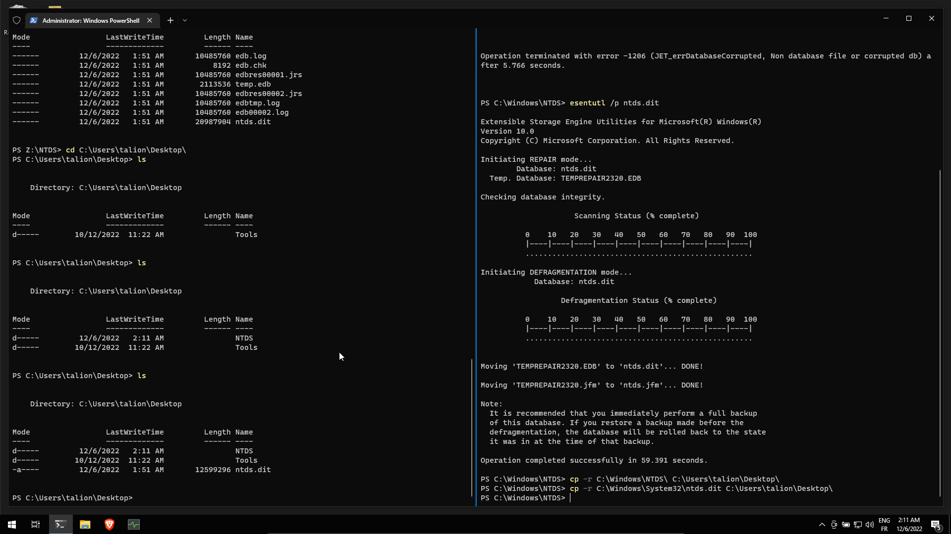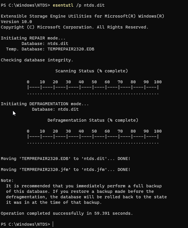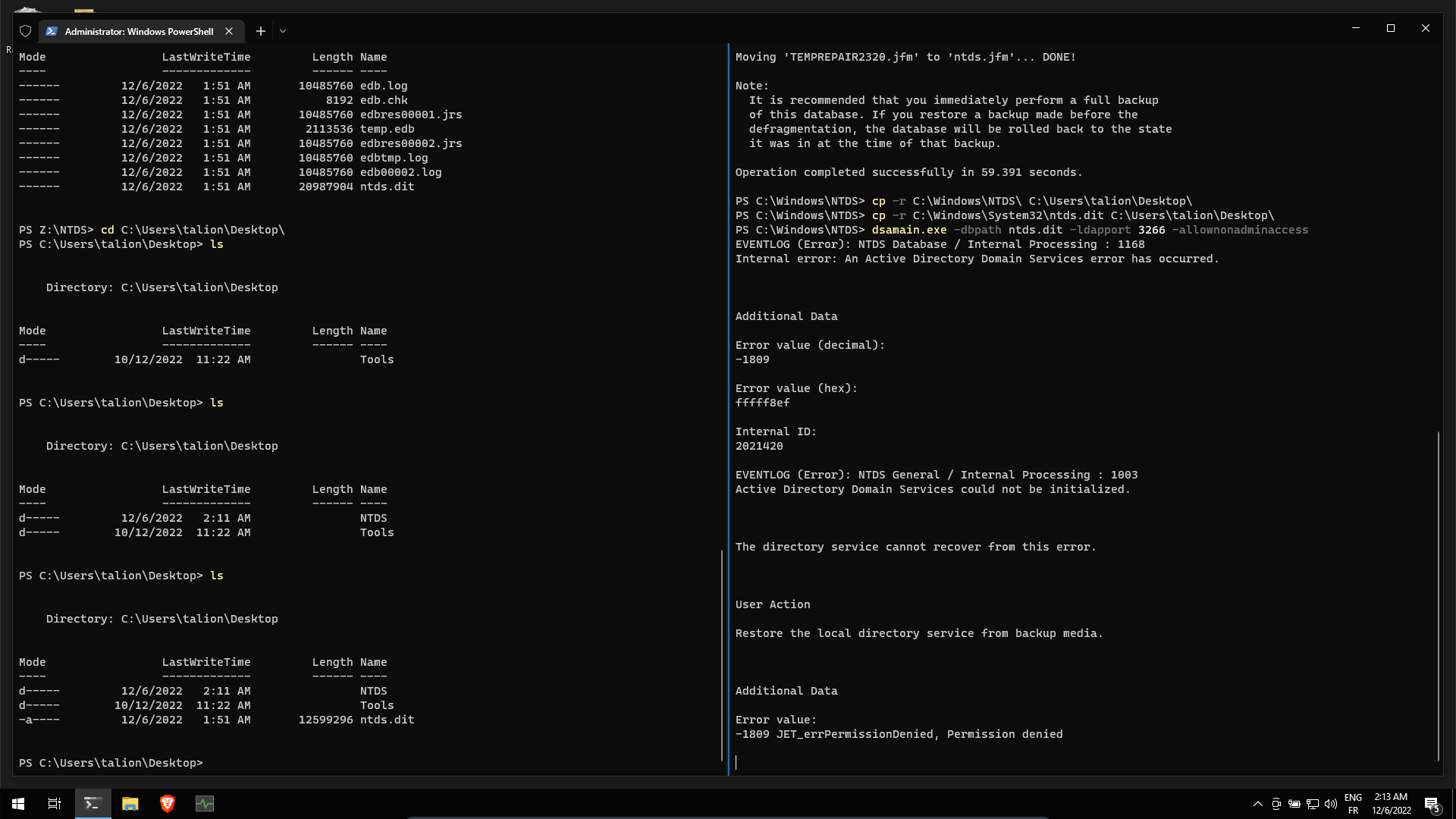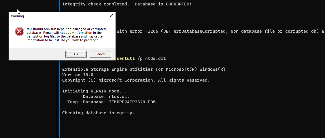Because my AD database copy was taken in a “naughty” manner, the solution to this issue is to use the esentutl utility to recover the database (apply the log files) then repair the database.