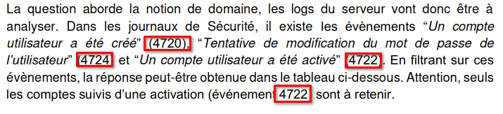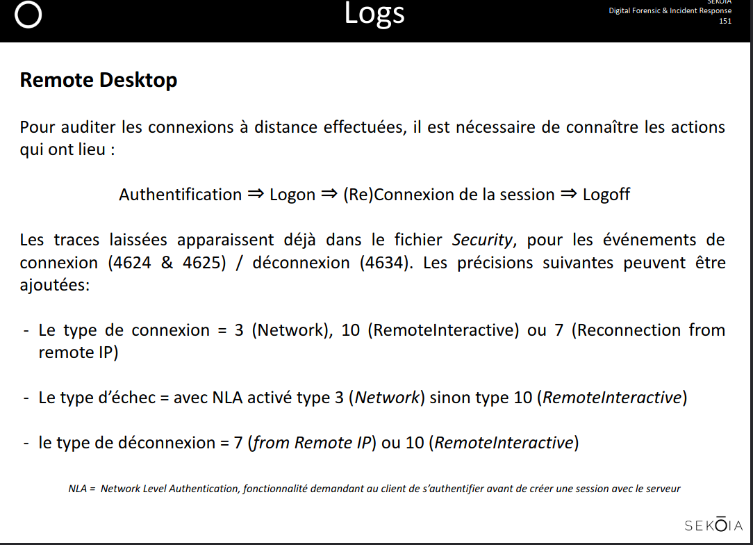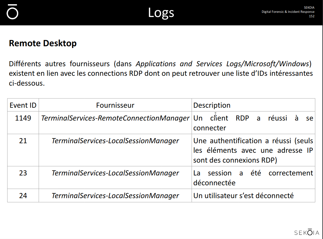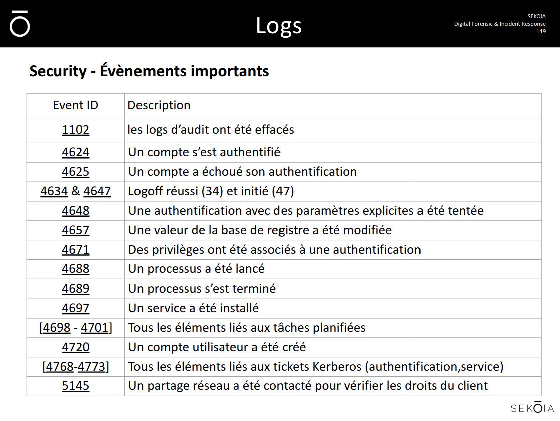 Révisions: slide 46 - Préparation - Identification - Confinement - Eradication - Remise en service - Retour d’expérience Connaitre les IDs des logs suivants