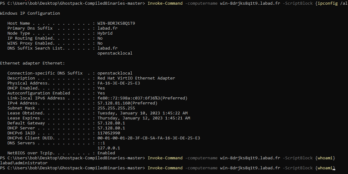 Invoke-Command -computername win-8drjks8q1t9.labad.fr -ScriptBlock {whoami}