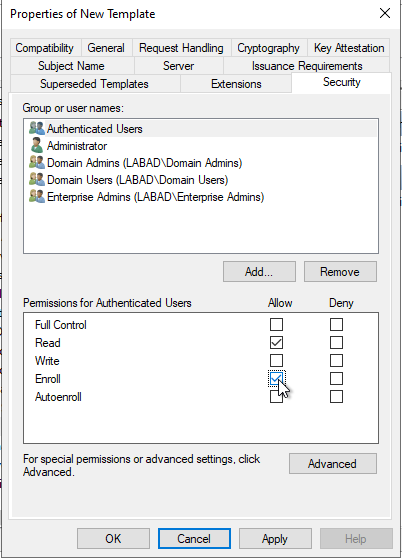 - The ADCS service gives the right to enroll a user without privilege (“user authenticated” for example).