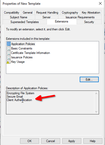 - The certificate template allows authentication via the certificate (Client Authentication EKU).