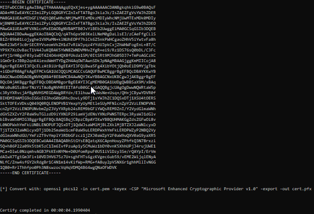 A certificate is generated (PEM). It must then be converted to PFX with the openssl command, and enter a new password for the certificate