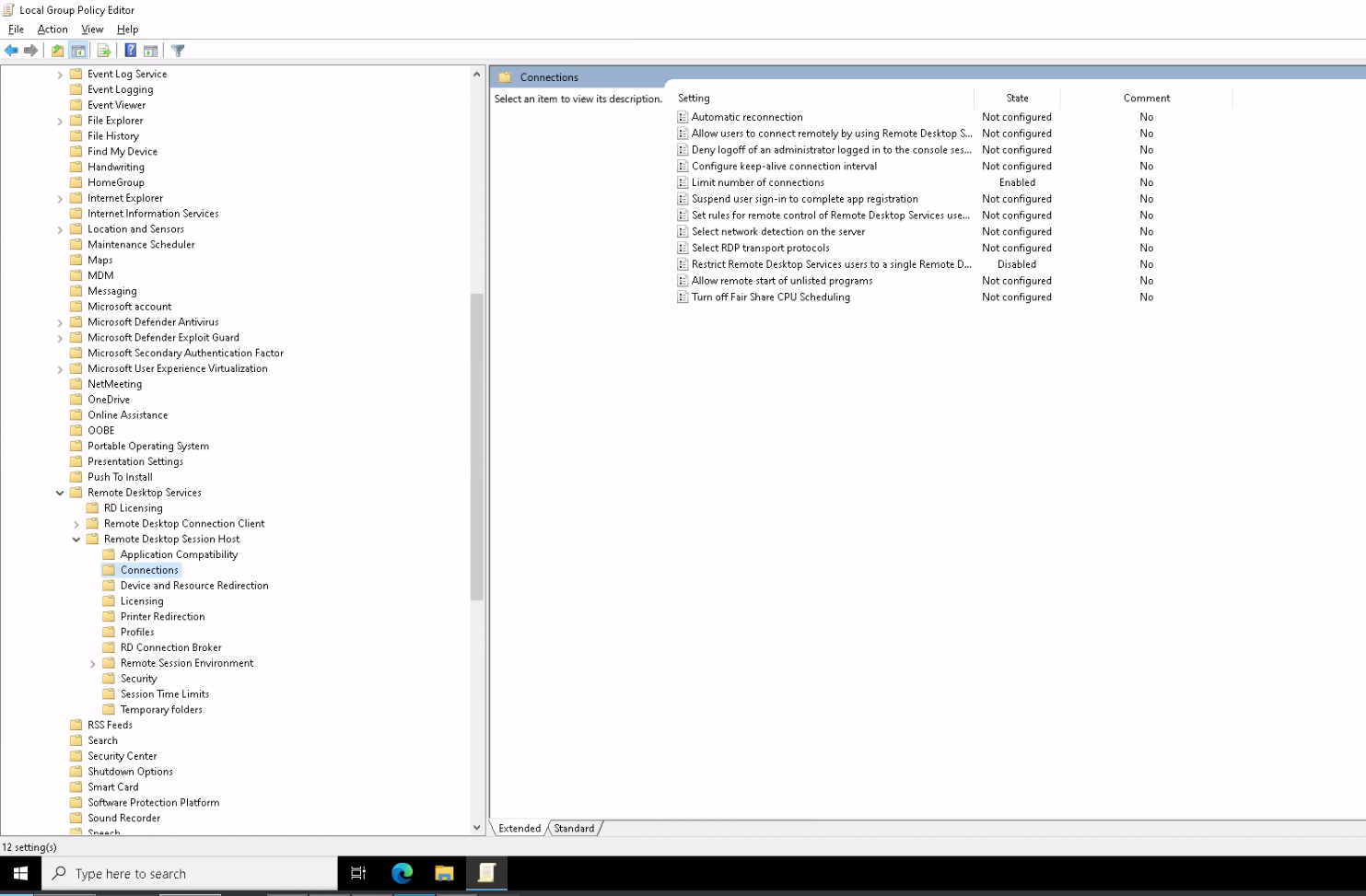 - Navigate to Computer Configuration >> Administrative Templates >> Windows Components >> Remote Desktop Services >> Remote Desktop Session Host >> Connections.